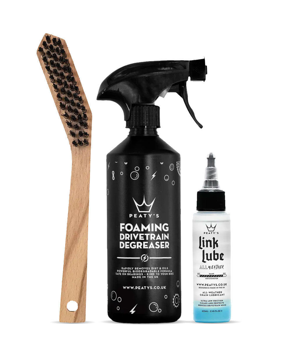 You’ll get a 500ml bottle of Foaming Drivetrain Degreaser, a 60ml bottle of LinkLube All Weather Chain Lube, and one of our much-loved Drivetrain Brushes.