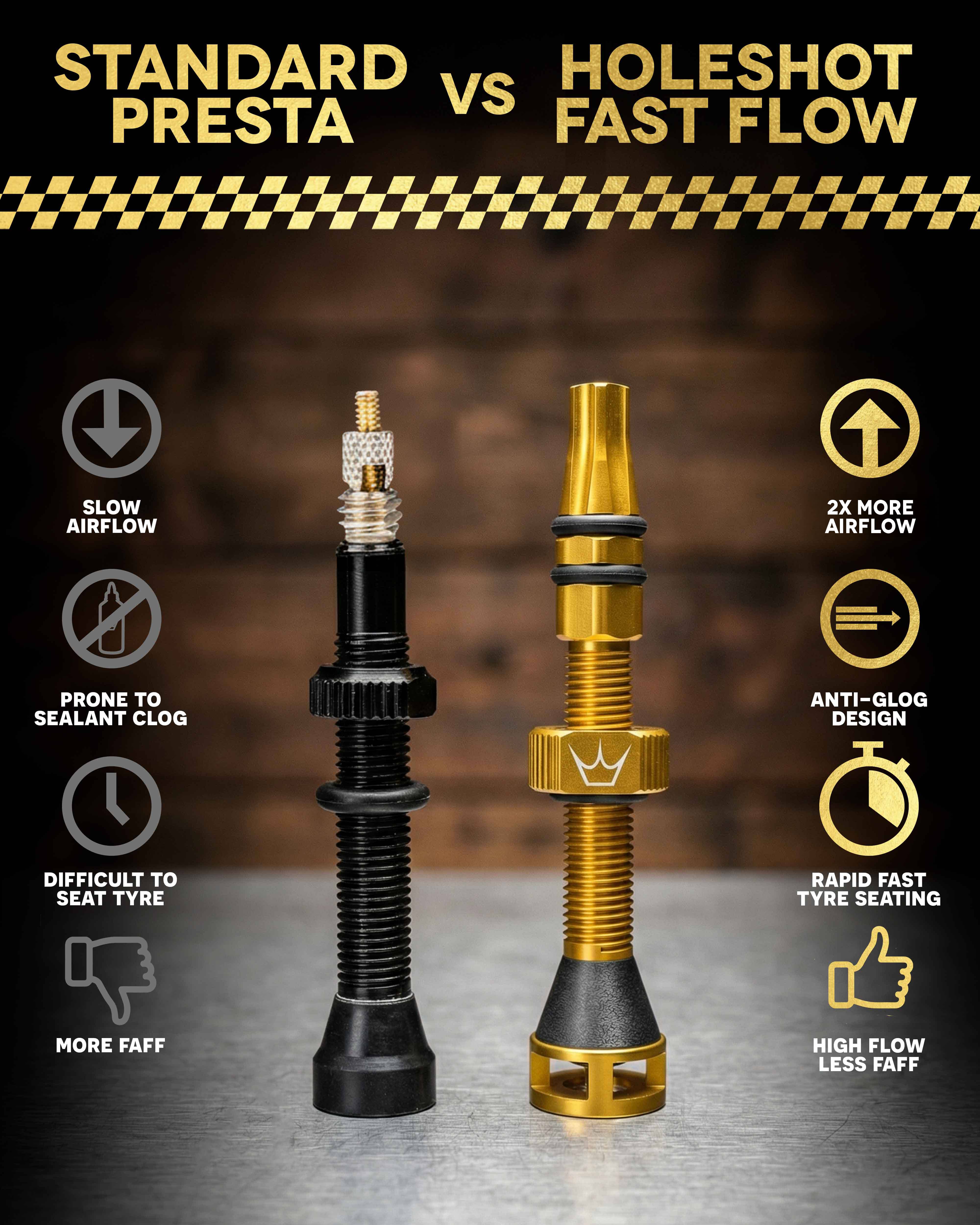The Holeshot Fast Flow Valves deliver twice the airflow, while the higher pressure seats tyres to rims with ease, reducing setup time and faff. No special tools, pumps, or compressors required.